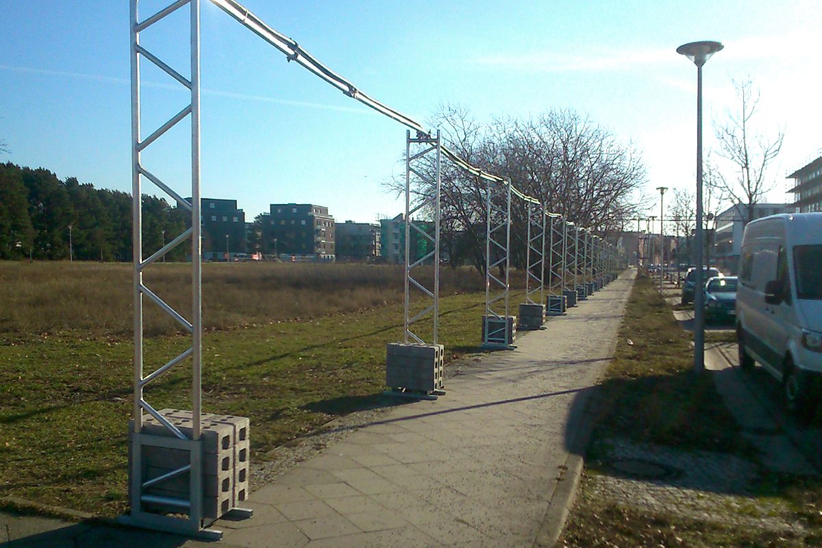 Als Gitterträger kommen Materialien aus dem Gerüstbau zum Einsatz. Sie werden in speziellen Kabelständern eingesetzt und mit Ballastgewichten versehen. Im Abstand von ca. 6 m wird mit Stahlrohr ein komplettes Ständersystem in Endlosmontage verlegt.